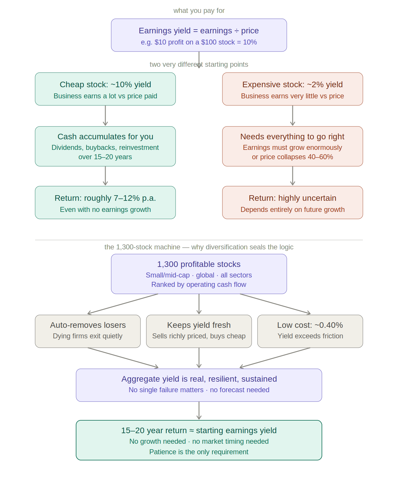 Your actual return equals: starting earnings yield + earnings growth + valuation re-rating − transaction costs. With zero assumed growth and zero re-rating, a 10% yield earns 10% in theory. In practice, small/mid transaction costs consume 1–2.5%, valuation drift adds noise, and currency moves matter. The realistic range over 15–20 years is 7–12% p.a. The starting yield is the dominant driver — but it is an anchor, not a promise.