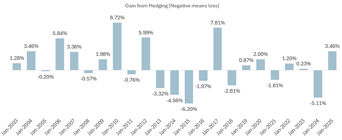 So net of the costs, how given the depreciation of the USD, how much roughly will we gain by hedging over the past 20 years?