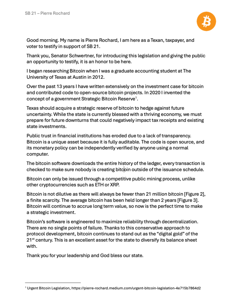 Riot Platforms’ VP of Research, Pierre Rochard, yesterday testified before the Texas Senate Committee on Business and Commerce in support of Senate Bill 21, which would establish a state Bitcoin reserve.