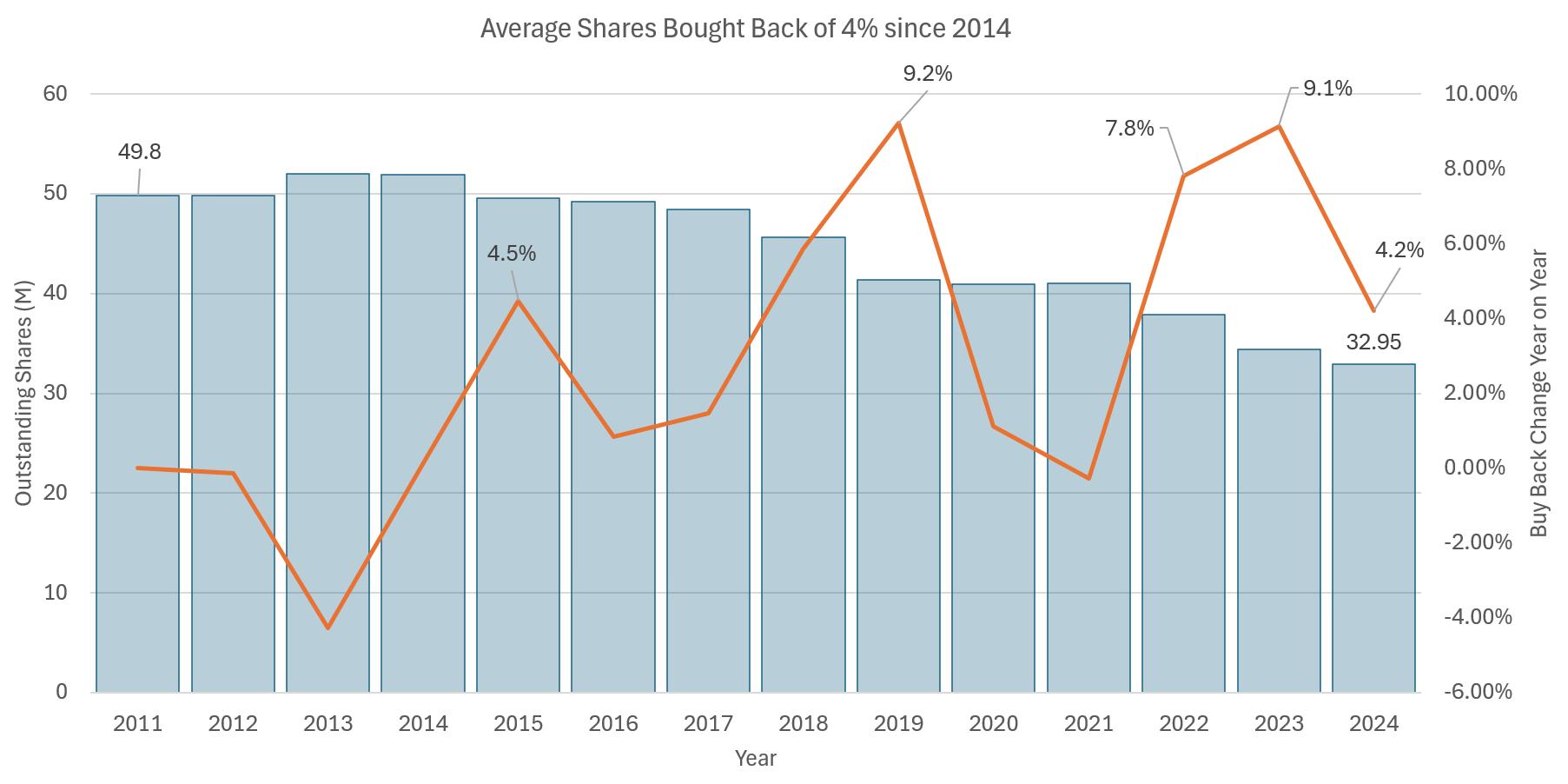 The share buyback has started showing about a 10% difference in earnings growth in the past few years.