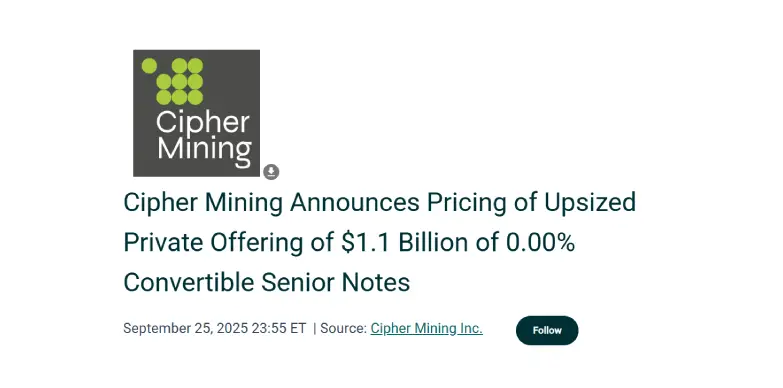 Cipher Mining Inc. (NASDAQ: CIFR), a leading developer and operator of large-scale industrial data centres, has completed the pricing of an increased private offering of $1.1 billion in 0.00% convertible senior notes which are due in 2031. The offering was initially set for $800 million but then the value was raised to satisfy strong investor demand. The deal is expected to close on September 30, 2025, after standard closing requirements are met.