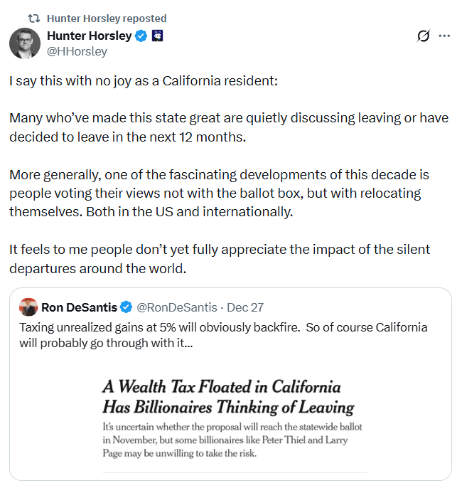 Senior figures in the crypto industry, including Bitwise CEO Hunter Horsley and Kraken co-founder Jesse Powell, argue that the measure would only result in billionaires leaving the state, with a negative overall effect.