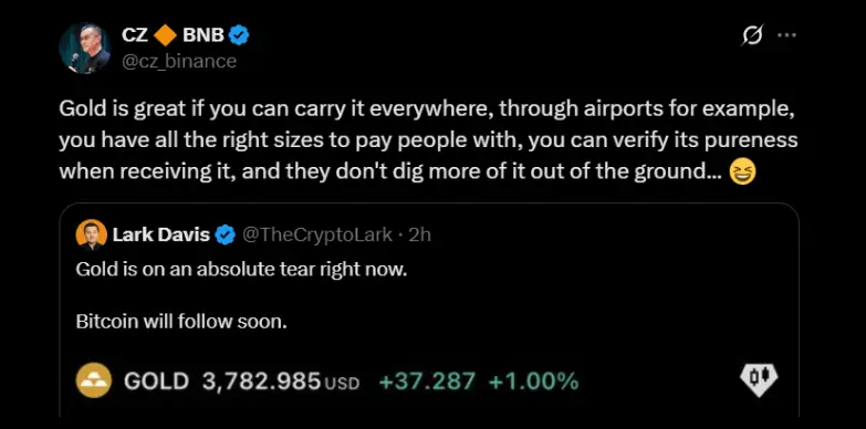 CZ made his comment in response to a post by crypto influencer Lark Davis, who wrote: “Gold is on an absolute tear right now. Bitcoin will follow soon”, after gold crossed $3,700 per ounce today, September 23, 2025. At press time, the price of gold has crossed $3,800 per ounce for the first time ever.