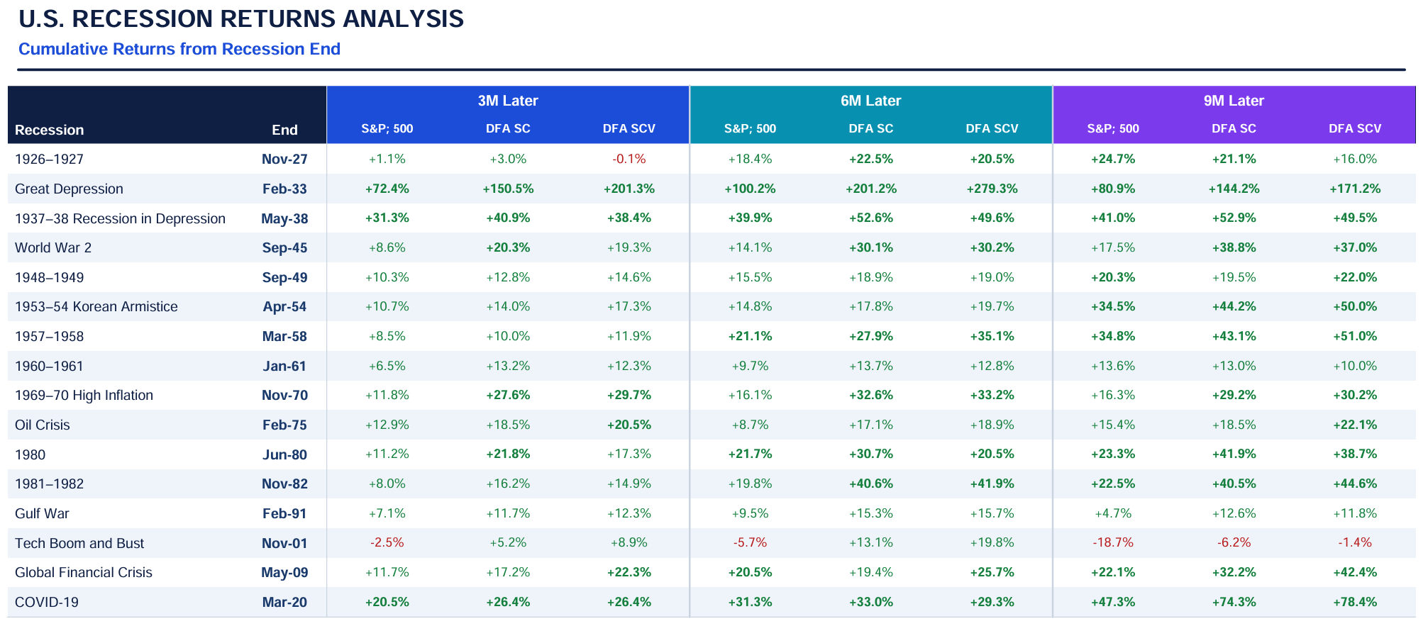Performance of S&P 500, Dimensional US Small Cap (SC) and Dimensional US Small Cap Value (SCV) months after Recession Officially Ends