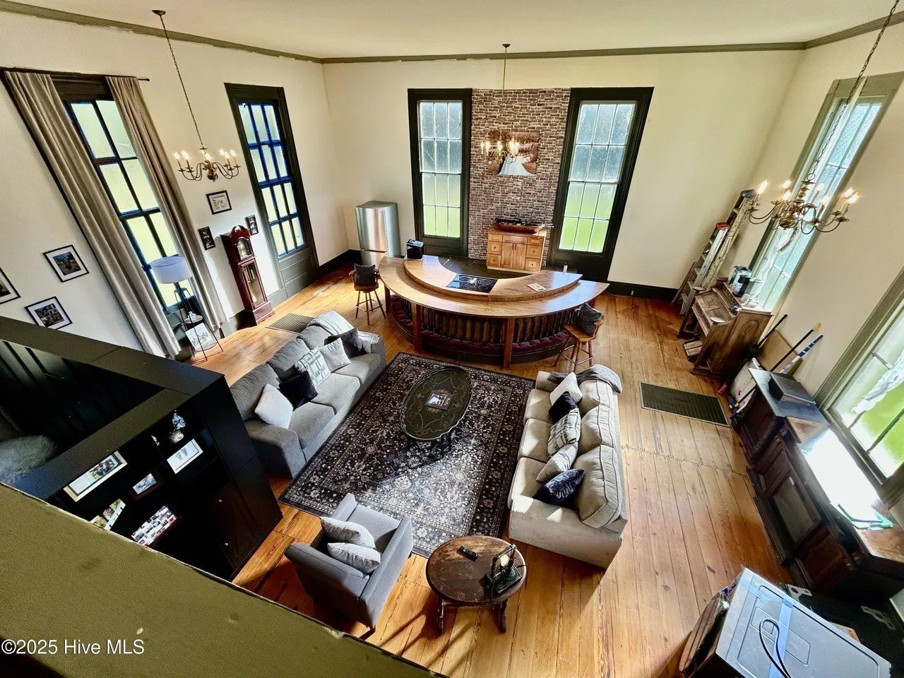 Historic highlights found throughout the home include heart pine floors, oversized windows, a loft, and a bell tower with a working bell.