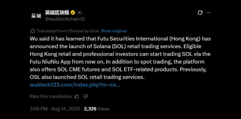 Futu Securities has announced the launch of Solana (SOL) retail trading services in Hong Kong today, August 14, 2025. This will mark a new chapter for the high-performance blockchain in the region’s regulated cryptocurrency market. This move will allow both retail investors and professional investors in Hong Kong to trade SOL through a popular app known as Futu NiuNiu App.