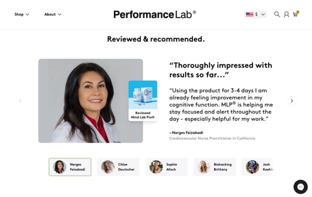 For example, Performance Lab understands that it operates in a highly specialized, low-trust industry. So, instead of showcasing customer feedback to build brand trust, it prioritizes specialist testimonials over traditional shopper reviews.
