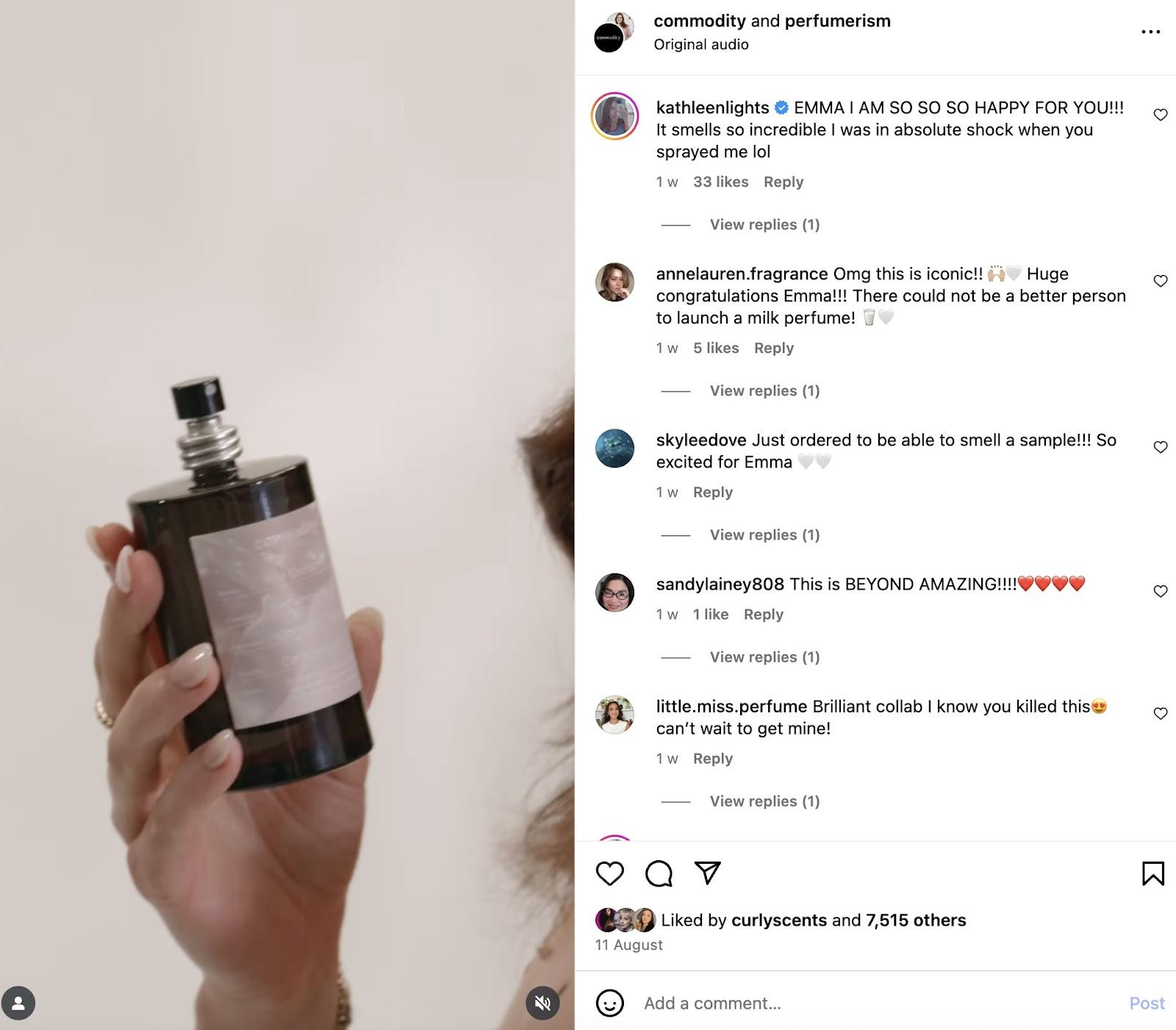 Check out this Instagram content where the influencer is collaborating with a brand to promote its new perfume. The comments section is filled with positive comments showing appreciation for the influencer’s recommendations.