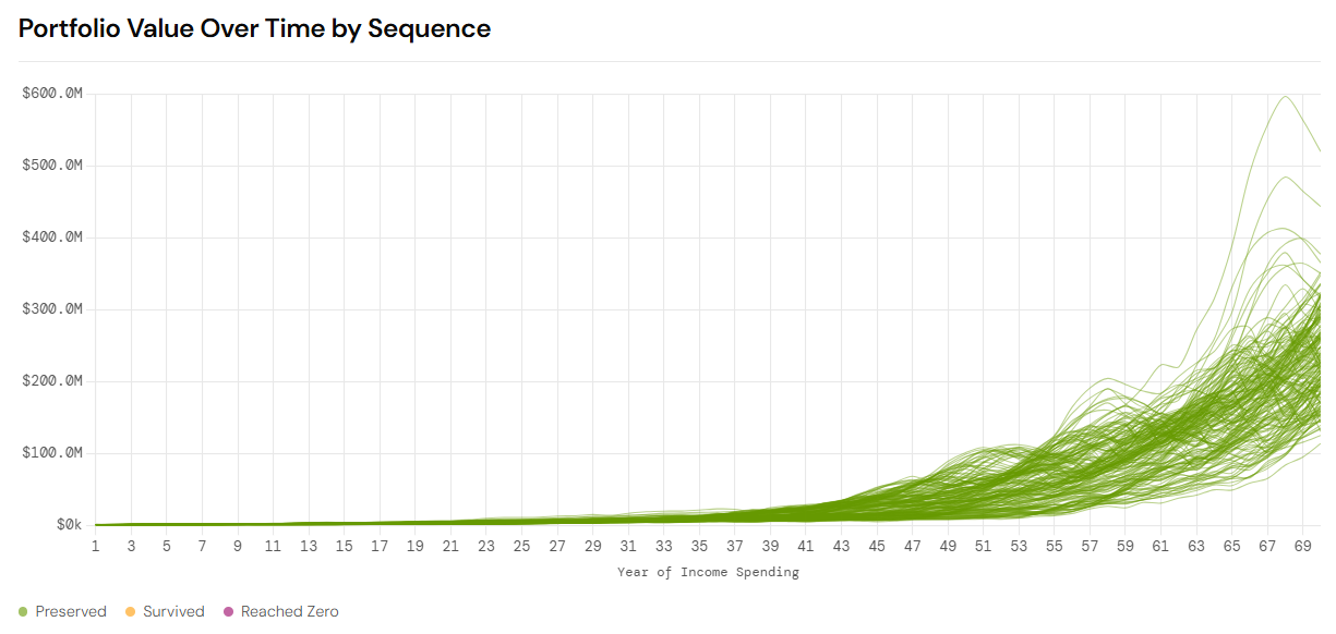 You should see many many threads of your portfolio value after spending and the safest would look like this: