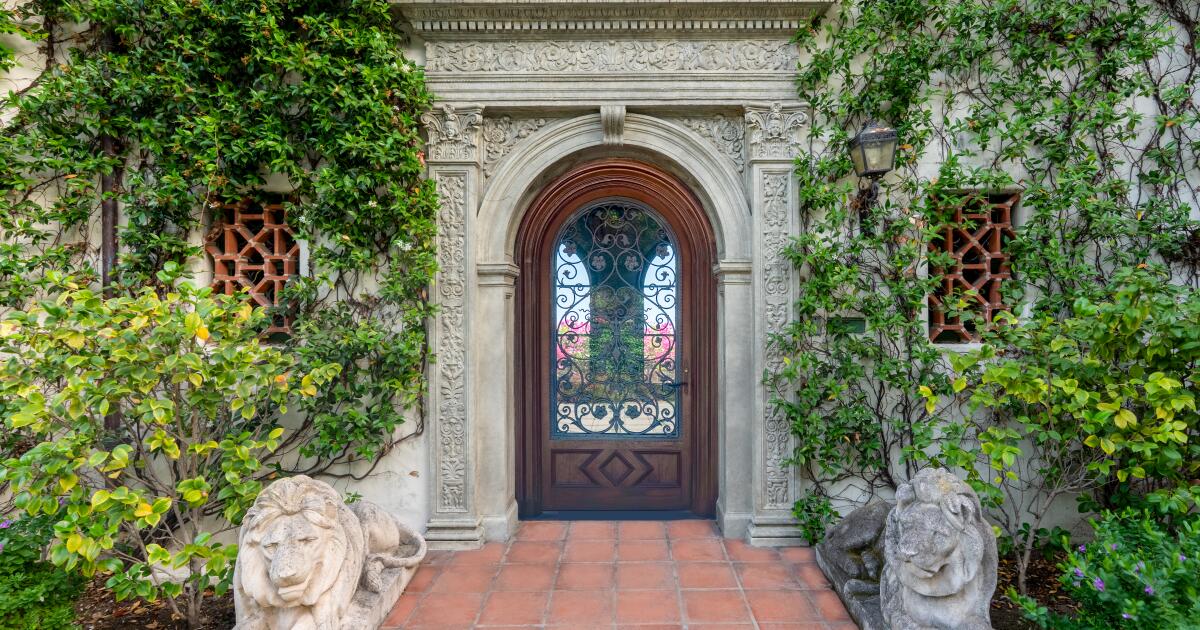Here, Williams deployed coffered ceilings, ornamental ironwork, stained-glass windows and colorful tile across two stories and nearly 9,000 square feet. In addition to 10 bedrooms and 11.5 bathrooms, there’s a wood-paneled library, wine cellar, pub and hidden bookshelf door that leads to the lower level.