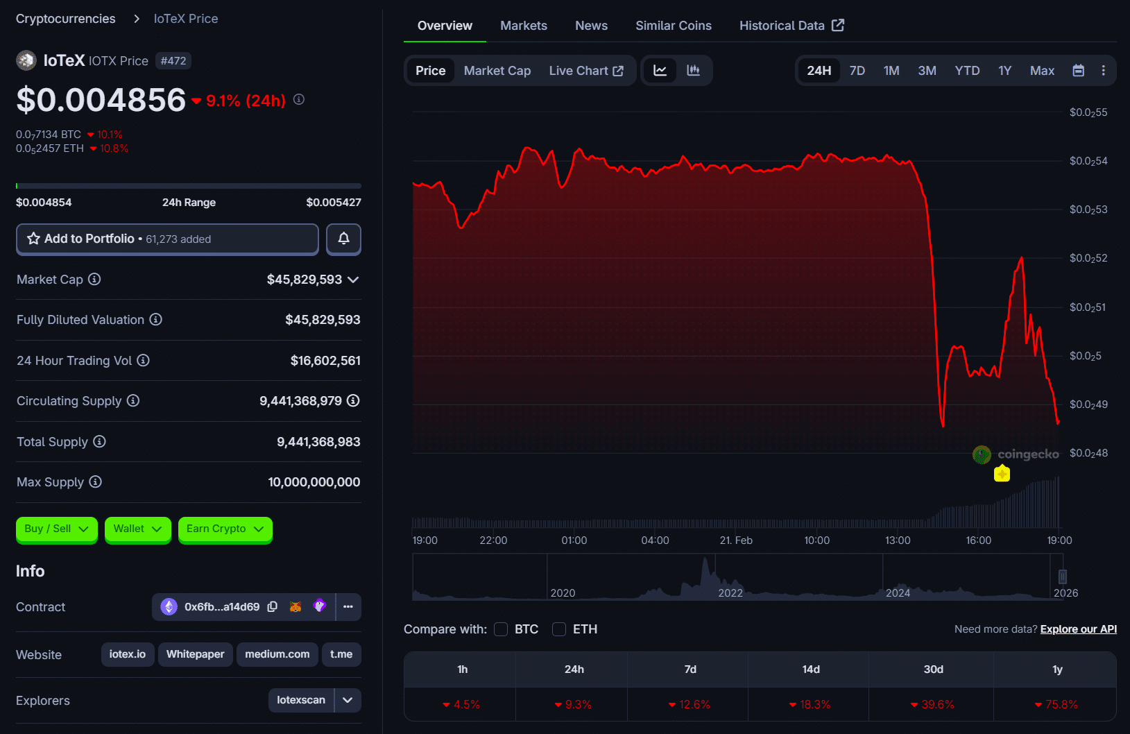 IoTeX’s IOTX coin dropped almost 10% after suspicious activity was detected in one of its token safes, CoinGecko data shows.