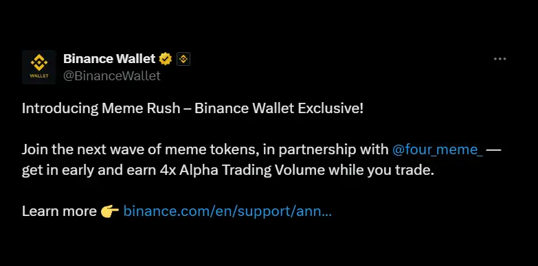 To reward active traders, Binance Wallet is offering a 4x Alpha points bonus during the Meme Rush event. Every trade that is made of Meme Rush tokens within Binance Wallet will earn four times the usual Alpha points. The bonus is said to continue for 30 days after the token appears on Binance Alpha, provided it meets Binance Alpha’s evaluation standards.