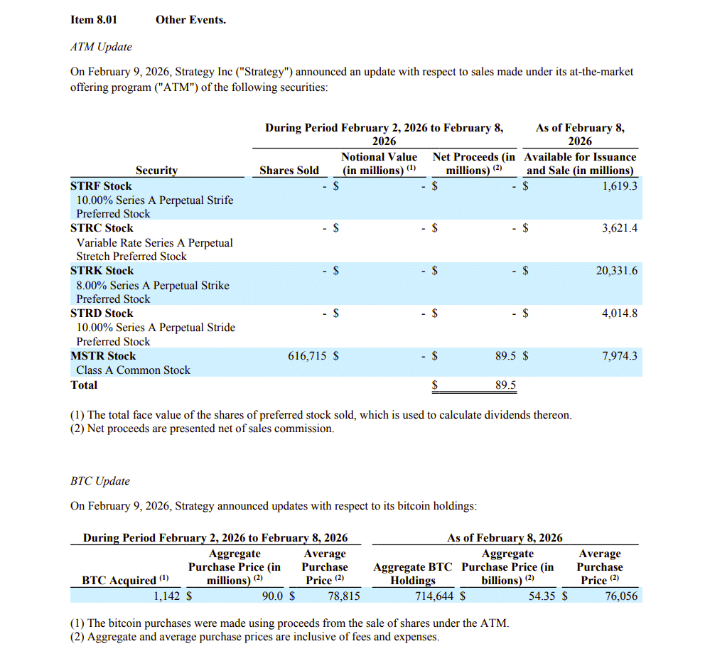 Strategy has acquired 1,142 BTC for ~$90.0 million at ~$78,815 per bitcoin. As of 2/8/2026, we hodl 714,644 $BTC acquired for ~$54.35 billion at ~$76,056 per bitcoin. $MSTR $STRC https://t.co/tJ7Ilwpc2l