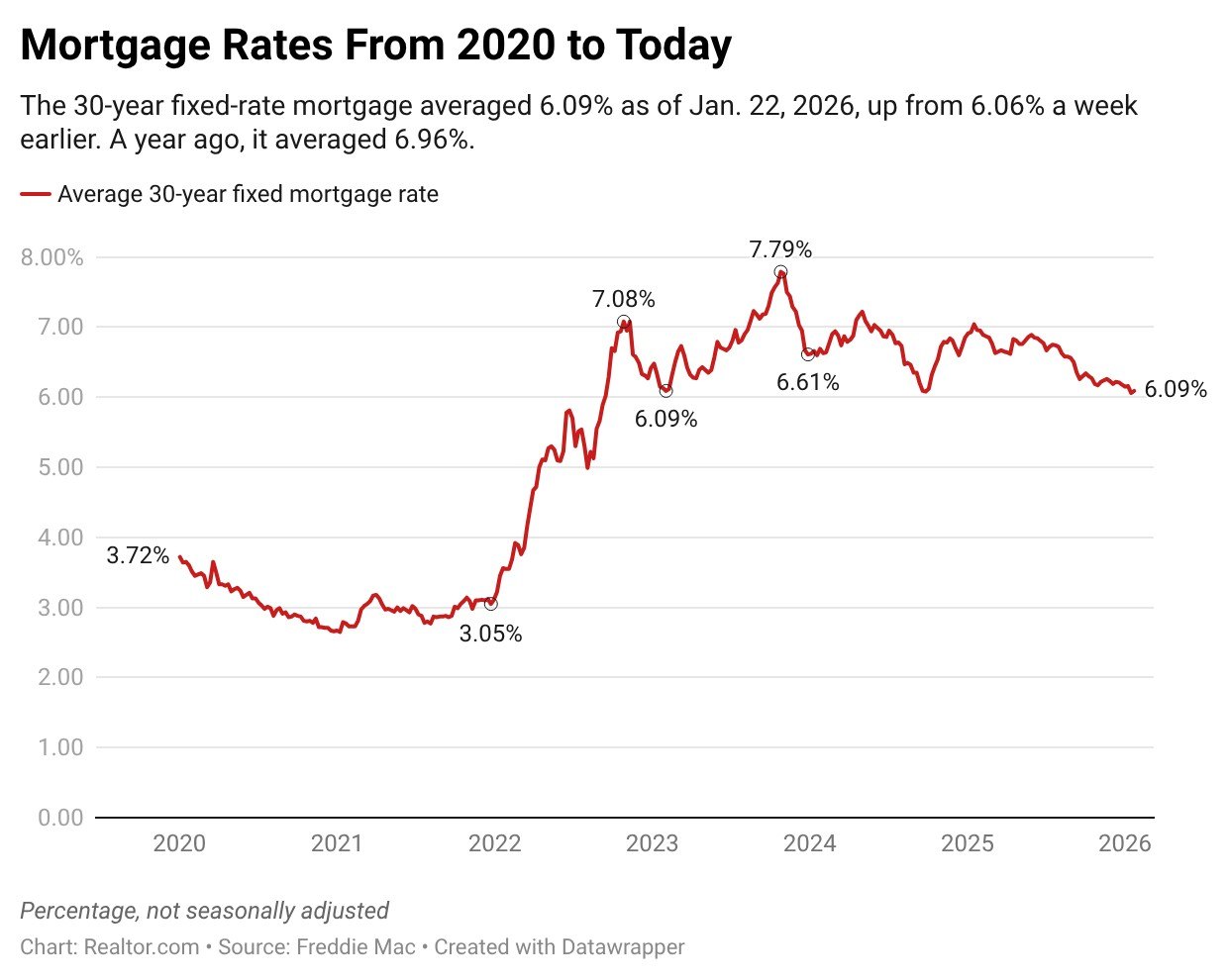 The average rate on 30-year fixed home loans increased to 6.09% for the week ending Jan. 22, up from 6.06% the week before, according to Freddie Mac. For perspective, rates averaged 6.96% during the same period in 2024.