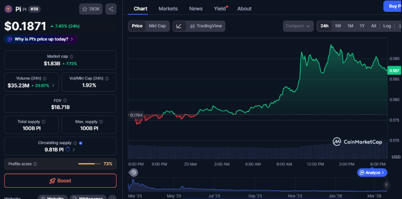 Pi Network’s Pi token has climbed around 7% today, March 20, 2026. With this surge, the price of the token is hovering around $0.185. With this blow up, the Pi coin has outpaced the broader crypto market’s 1.23% gain, amid excitement for the v21 protocol upgrade.
