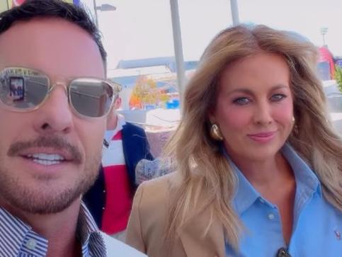 Perhaps fellow Hyams Beach owner Darren Palmer, judge on The Block, was telling Sam Armytage now was a great time to list her Hyams Beach cottage? They were photographed together at The Australian Open. Picture: Instagram