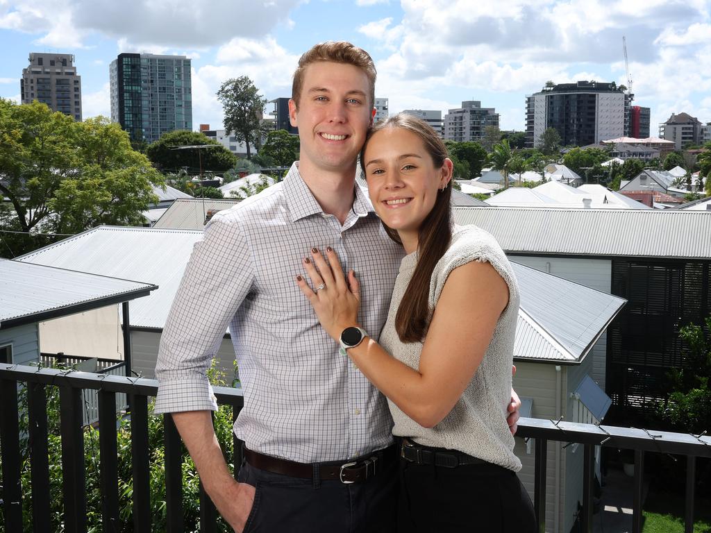 Jacob Mulcahy, 26, with fiancee, Callie Abrahams, 26, are looking to buy a house in Brisbane later this year. Picture: Liam Kidston.