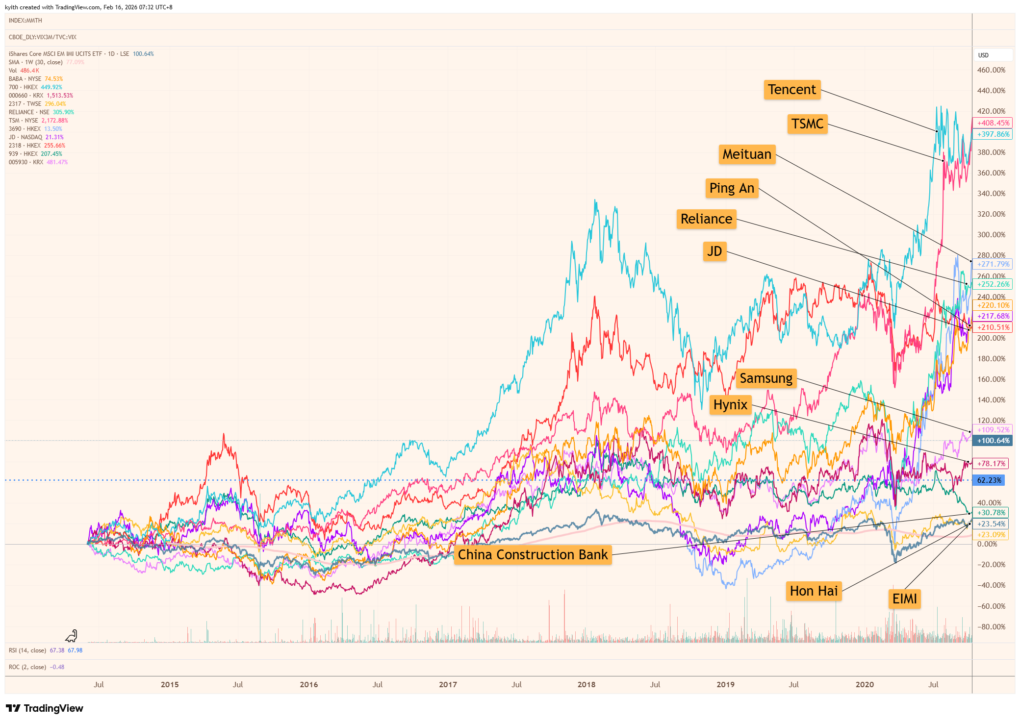 I put out all the original top 10 stocks that exist in the EIMI factsheet in Oct 2020, together with EIMI in the following chart to show the performance since then: