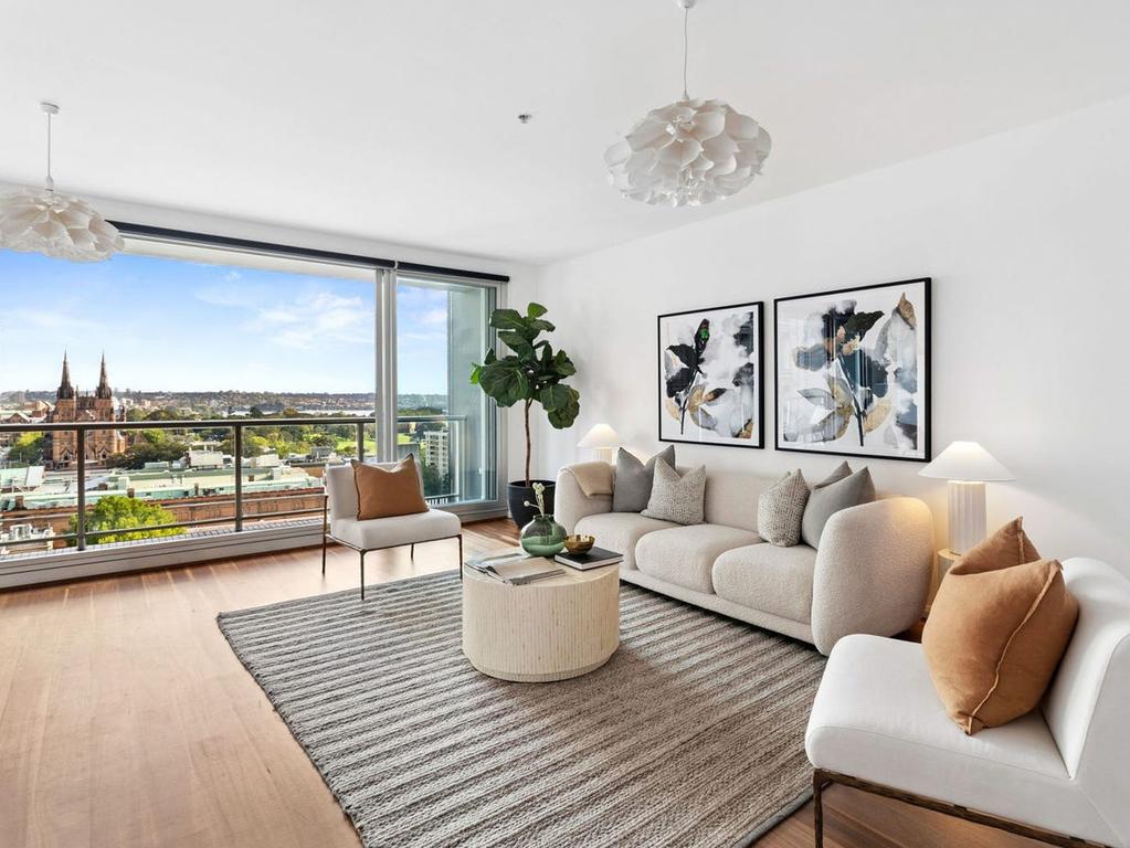 From the 12th floor of the Marchese and Partners designed Lumina building at 1 Francis St, the residence has a postcard backdrop of Sydney’s most famous landmarks, including views over St Mary’s Cathedral, The Domain and harbour.