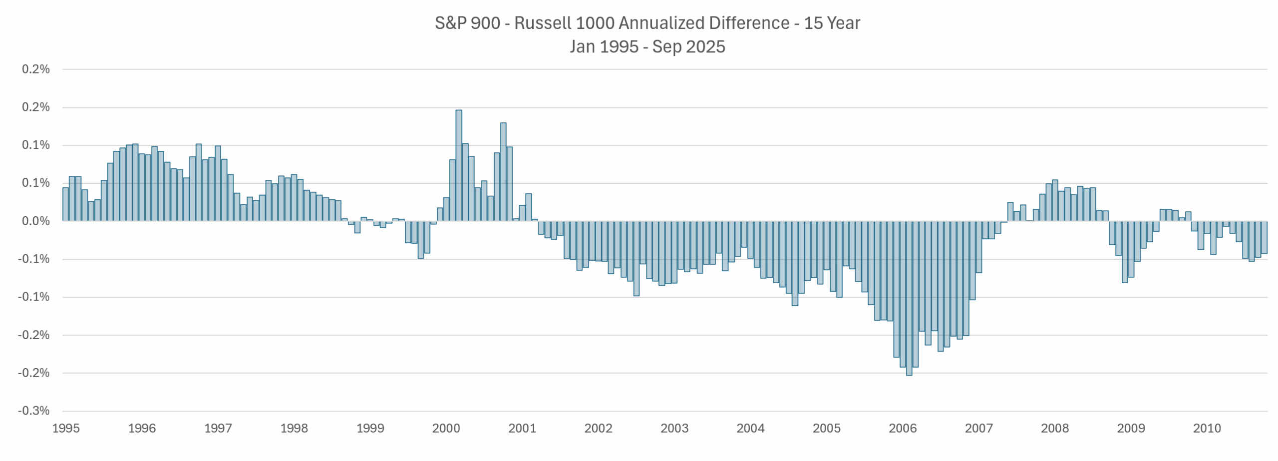 The following chart shows the 1-year performance of the S&P 900 returns (capital appreciation + dividends) minus Russell 1000: