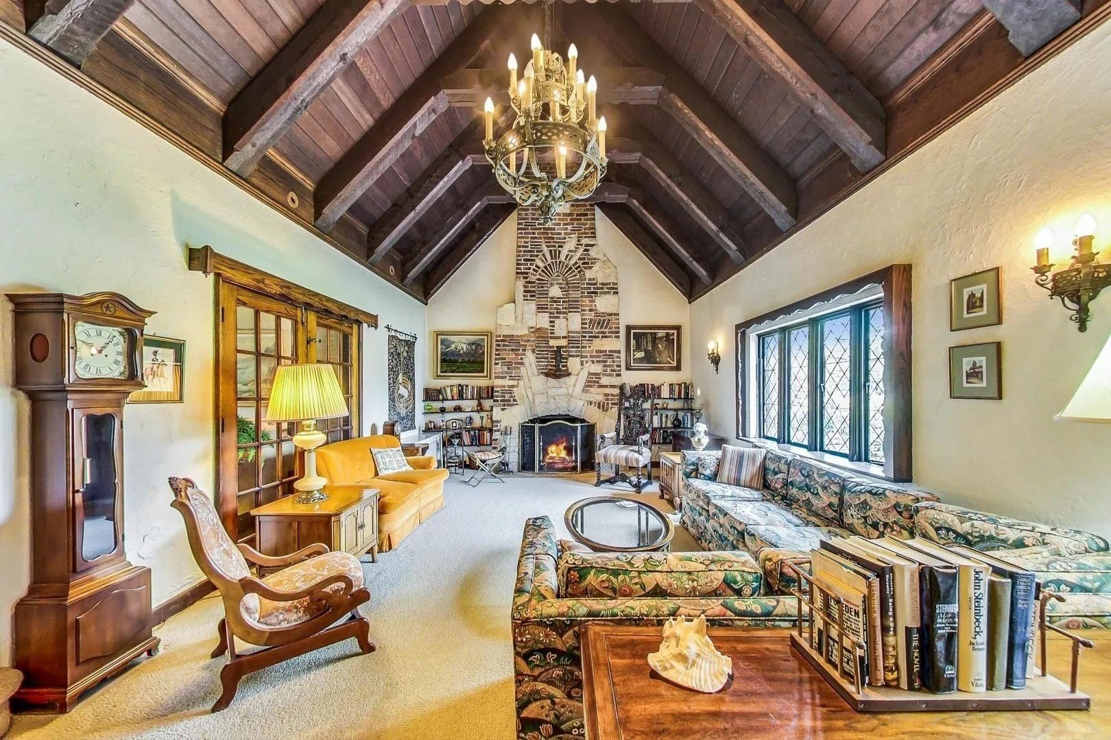 A custom marble fireplace can be found inside the grand sunken living room that also boasts dramatic cathedral ceilings and diamond-shaped leaded glass windows. French doors from here open up to a secondary family room with designer lighting and oversized windows to let in an abundance of natural light.