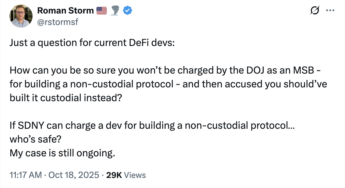 Tornado Cash Dev Roman Storm Warns Community About Retroactive Prosecution