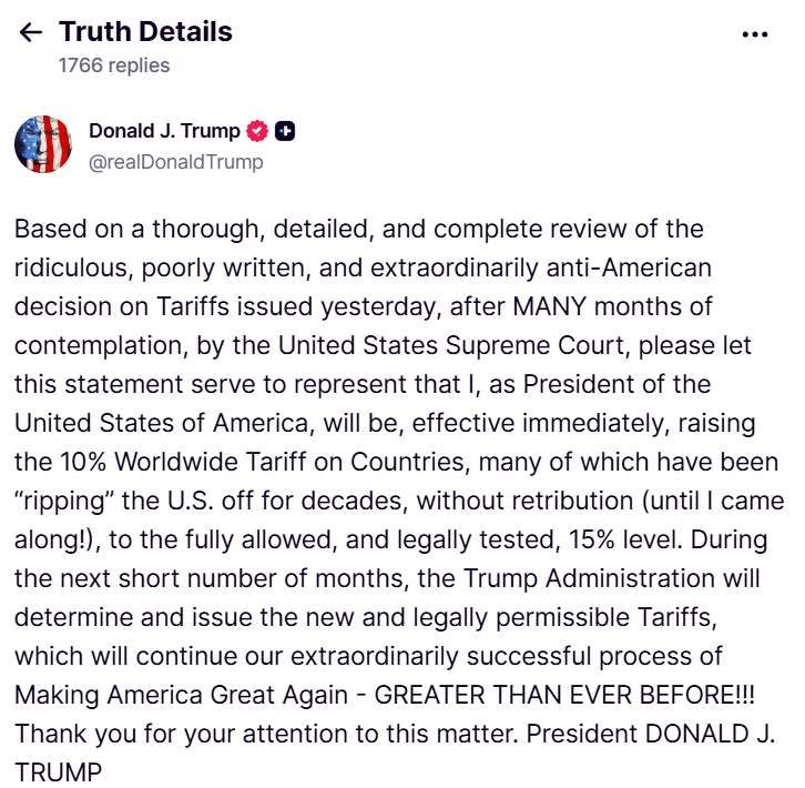 President Donald Trump announced Saturday an immediate increase in the global tariff from 10% to 15% in a move widely seen as a response to a court decision on Friday that struck down certain duties he imposed under the International Emergency Economic Powers Act (IEEPA).