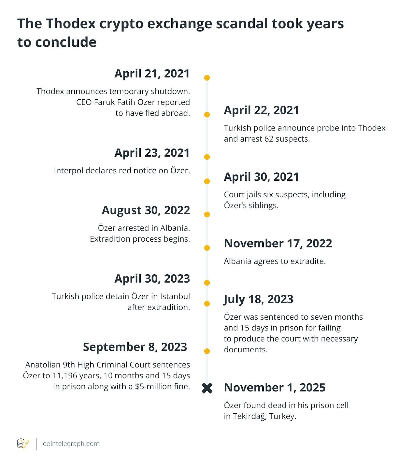 Faruk Fatih Özer was found dead in his prison cell on Nov. 1. The former CEO of now-defunct crypto exchange Thodex was serving an 11,000-year sentence for running one of the largest crypto scams in history.
