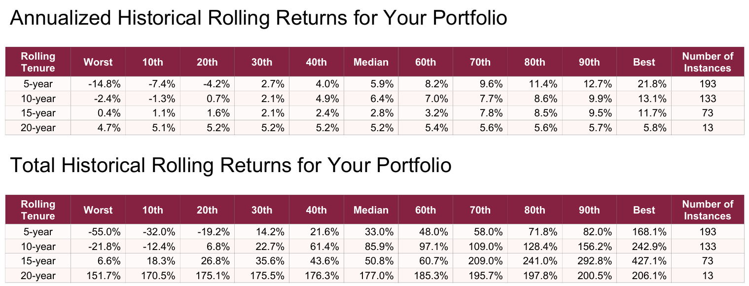Number of instance show how many x-year periods we are able to simulate. For example, 193 instance of 5-year rolling tenure, means there are 193 5-year annualized returns from Oct 2004 to Dec 2025.